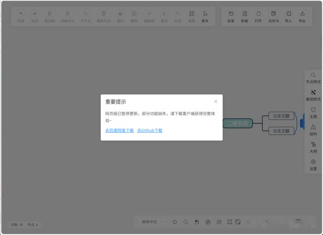 打开的方式依然是常规的浏览器“IP:端口号”,打开之后会有一个提示,说的是网页版已暂停更新,部分功能确实。不过就我个人体验来看,它的网页版功能已经满足90%以上的用户对思维导图的需求了,直接使用