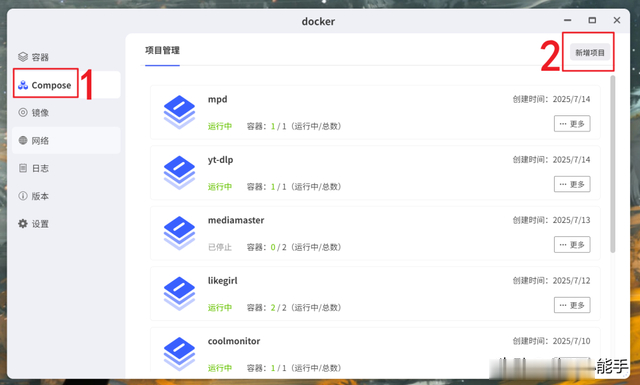 我这里以极空间NAS为例为大家演示,直接打开极空间NAS的“Docker”应用,点击【Compose】 > 【新增项目】。