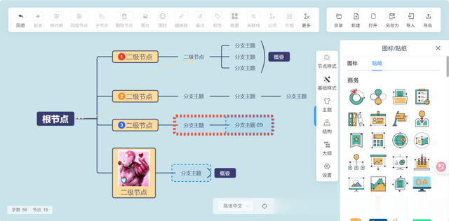 节点内容支持文本(普通文本、富文本)、图片、图标、超链接、备注、标签、概要、数学公式