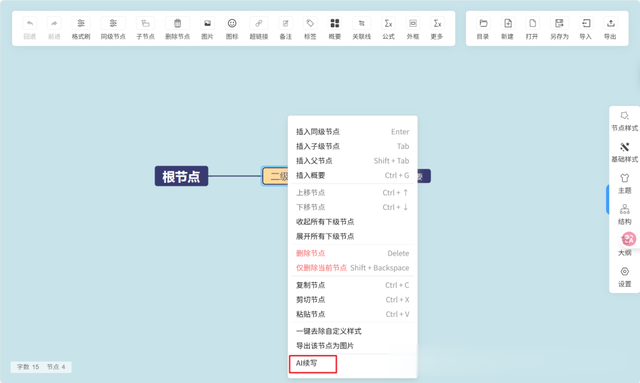 操作就不用多介绍了,用过思维导图的基本上直接就能上手。比较让我意外的是它这里还多了一个“AI续写”,放在别的思维导图可能就又是“收割一波”了。