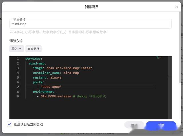 在新增项目页面自定义项目名称,输入以下 Docker Compose 配置信息后点“创建”按钮: