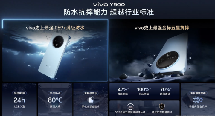 第三个 “最强” 体现在抗摔上,vivo Y500 采用 “金刚磐石架构”,内部加厚了防撞杆,主板支架升级成航空级铝合金,还加了缓冲泡棉,相当于给手机内部装了安全气囊,平时不小心把手机摔地上,不用慌慌张张捡起来检查 主板抗摔能力全方位强化,内外都抗造。